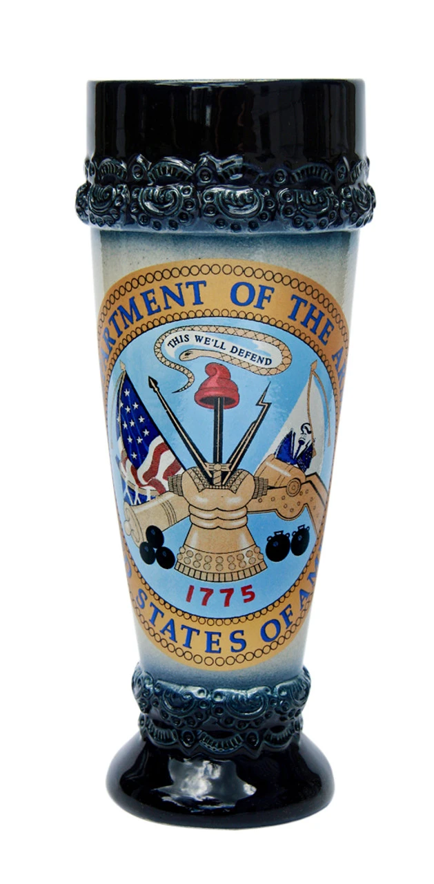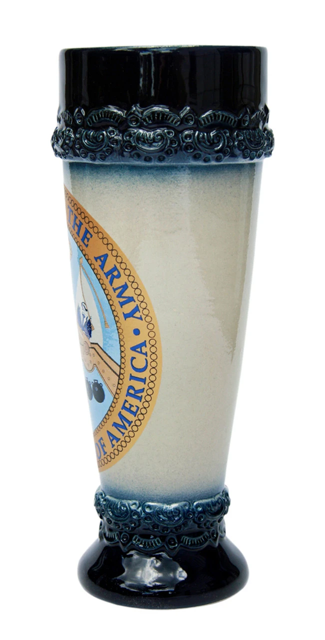 German stoneware wheat beer cup (Weizenbiertulpe) with US Department of the Army emblem. An attractive cobalt blue glaze on the rim and base accents this sturdy wheat beer cup.