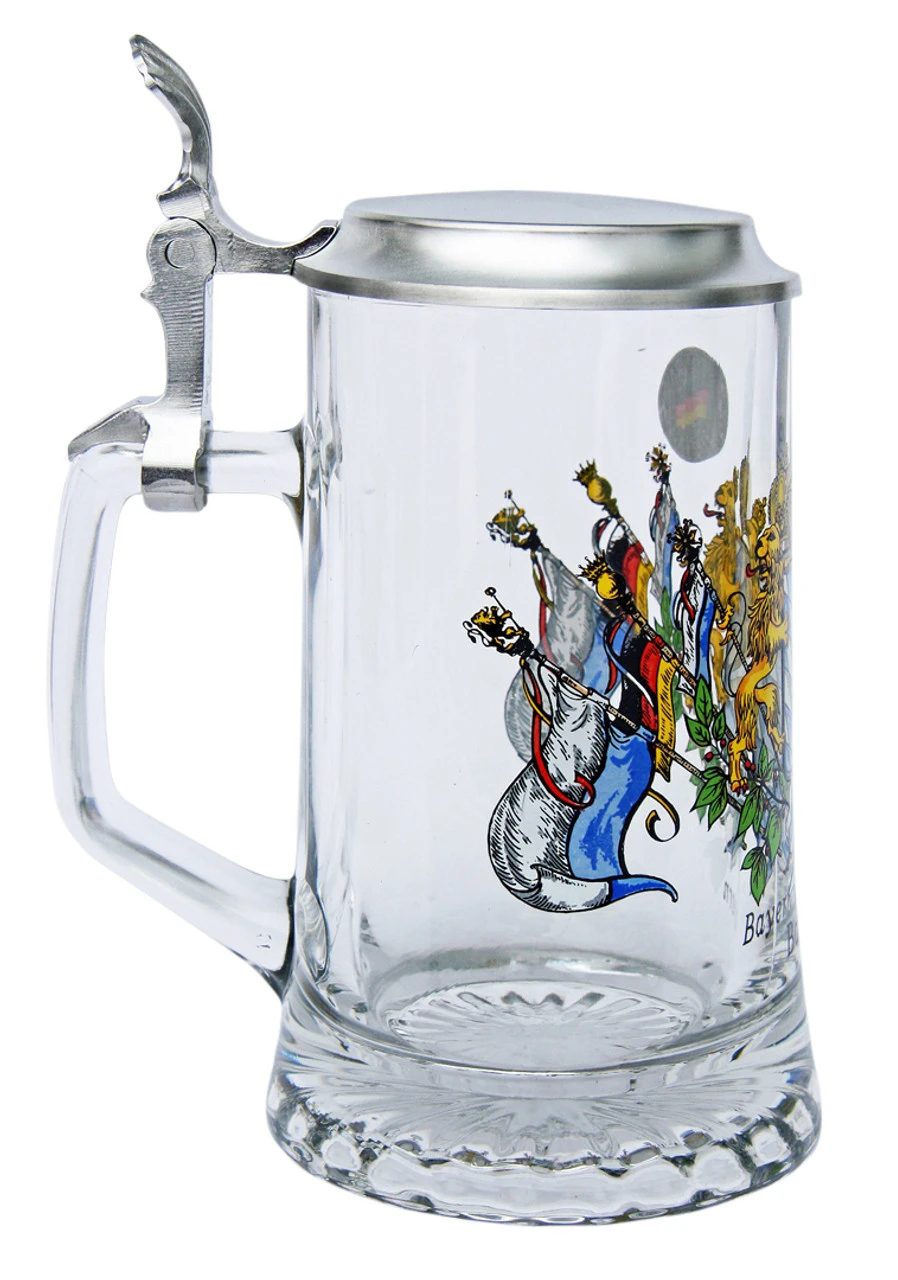 This German made beer glass features a stunning hand painted illustration of the Bavarian crest. The crowned lions astride the crest are painted with surprising attention to detail. The crest is flanked on either side by laurels, two Bavarian flags and the German flag. The stein reads “Bayern” below the crest. A light-reflecting starburst pattern forms the base of the glass beer mug, while a flat pewter lid with shell thumblift sits on top.