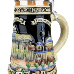The Brandenburg Gate (Brandenburger Tor) is highlighted on the front of this relief decorated German stein celebrating the capital city of Berlin. A waving banner reads “Berlin” with city coat of arms. The sides depict famous landmarks in Berlin including Checkpoint Charlie, Kaiser Wilhelm Memorial Church (Gedächtnis Kirche), the Fernsehturm and Berliner Dom (Berlin Cathedral Church).