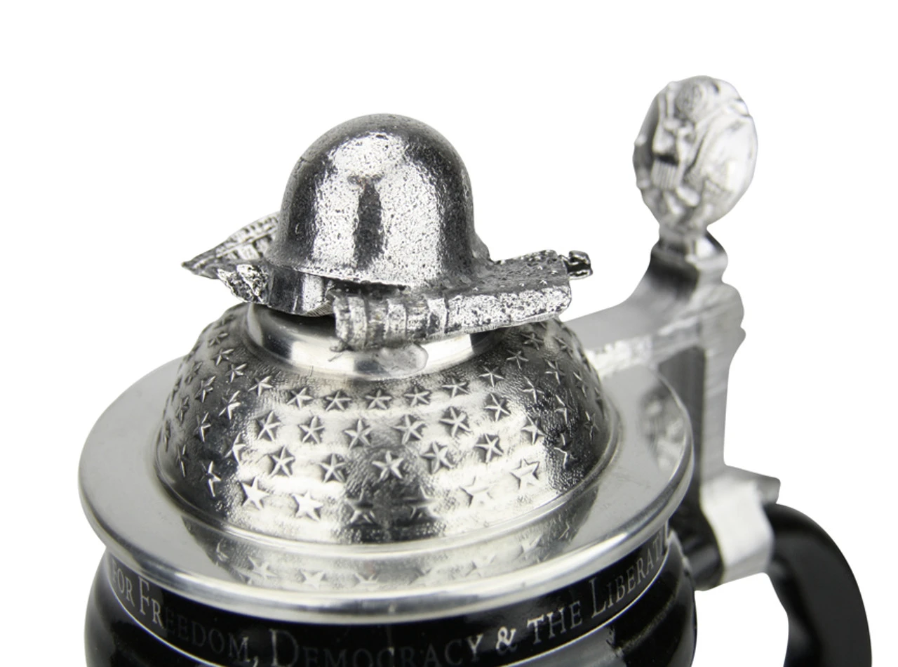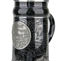The body of the beer stein is a smooth, black glazed, high quality stoneware decorated with a platinum wrap around design. Crafted in tribute to those who fought on June 6, 1944 this stein details the participation of the Allied countries that invaded the coast of Normandy that day. Along the top border are the words, “IN MEMORY & HONOR OF ALL WHO FOUGHT FOR FREEDOM, DEMOCRACY, & THE LIBERATION OF EUROPE.” Spanning the center of the beer stein is a map of the coast of Normandy complete with drop-zones, beachfronts and landing points from the detailed information given on the left and right side of the beer stein. A pewter medallion is situated at the center of the wrap around decoration featuring part of the Normandy coast design along with the text, ” D-Day June 6th 1944.” Below the medallion on the body of the beer stein is a sketch of troops making their way through the water to the coast. Above the medallion are the words, “All Gave Some””Some Gave All.” The ornamental pewter lid supports a combat helmet resting on the flag of the United States of America and the pewter thumblift features the US Eagle Seal.