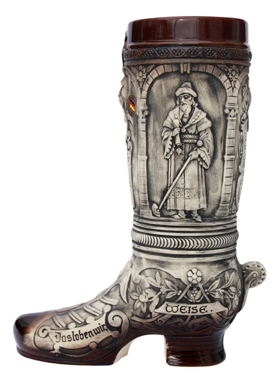 This German made 2 liter ceramic beer boot was originally modeled in the 1920s when the tradition of drinking out of a boot became known (see history below). One side depicts a soldier with helmet in hand and the text “TAPFER.” “Froh beim Bier.” which translates as: “BRAVE.” “Happy with beer.” The reverse side shows a wise man with scroll and walking stick pointed at a skull as if to say “leave me alone death”. The text reads: “WEISE.” “Das loben wir.” which translates as: “WISE.” “That’s what we like.”