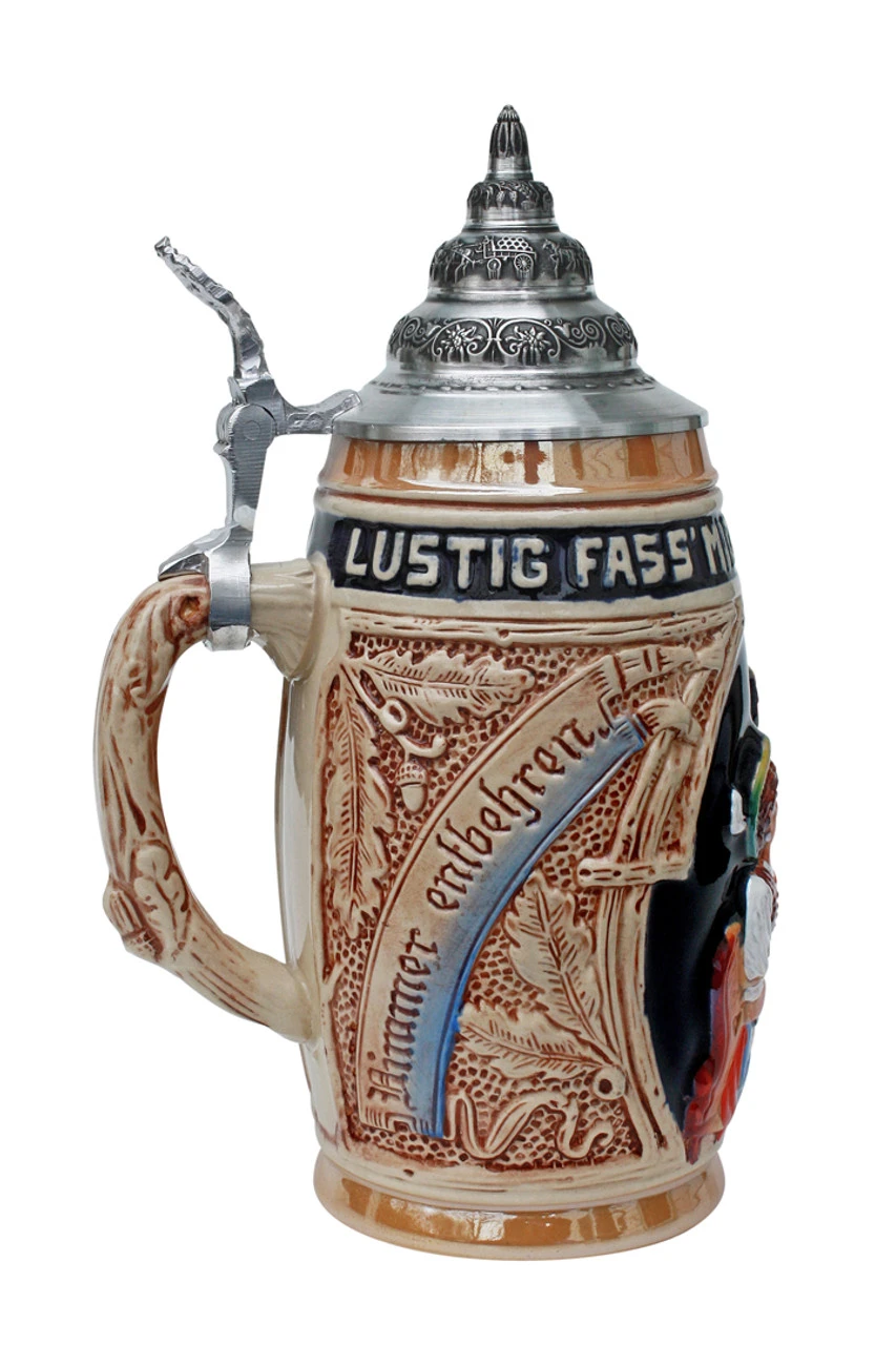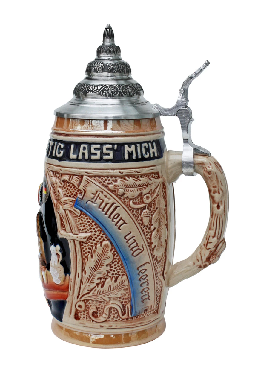 This traditional barrel shaped beer stein features a couple in traditional German dress – dirndl & lederhosen – sitting in an old German brew pub. The hand painted decoration stands out on this stein’s deep cobalt blue background. Acorn, leaf and stylized wood stoneware handle.