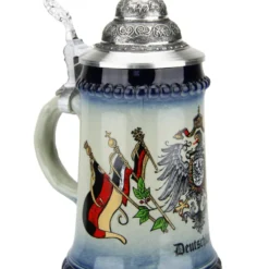 This German beer stein features a full wrap decoration of a German eagle crest with crown and German flags flying on either side. Text below flag crest reads: “Deutschland”.
