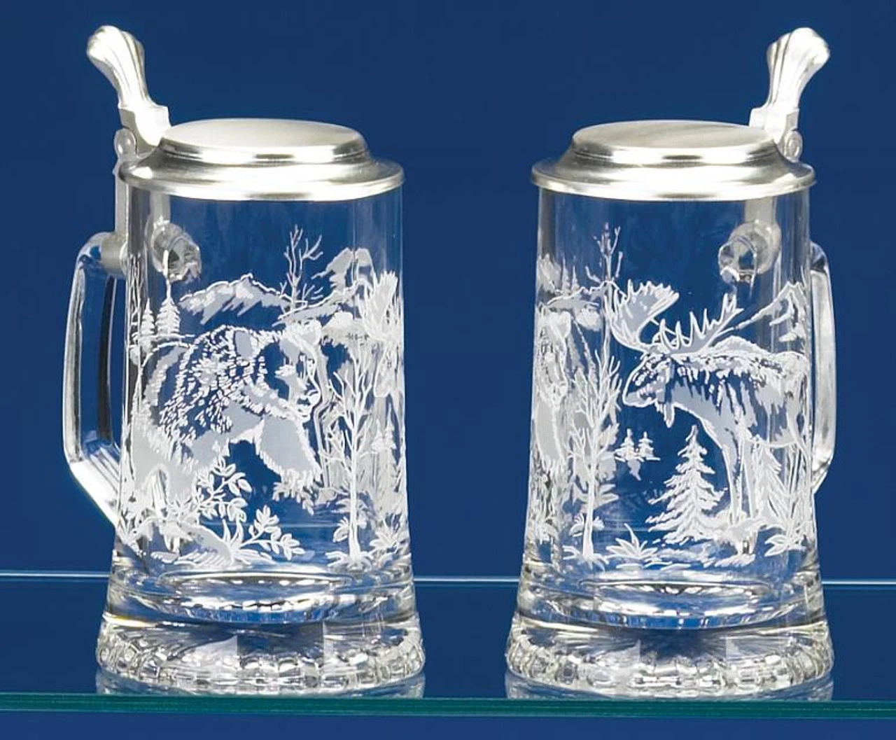 This glass beer stein features a stunning relief of a powerful grizzly bear and a stoic moose in a mountain forest. The etched-style print motif prominently displays the two great creatures in a beautiful setting. Engrave a message for the outdoorsman in your life above the two animals for a great gift. The beer glass features a starburst light-reflecting pattern on the bottom and pewter lid.