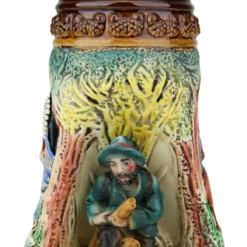 This beer stein features a unique grotto or cave that is molded into the body with a hunter sitting inside accompanied by his loyal dog. The hunter and dog are made from compressed marble dust from the world famous Carrara mines and is hand painted in northern Italy. The stein body depicts woodland creatures with a family of deer on one side and a mountain goat or Alpine Ibex/Steinbock in the Alps on the reverse. Hand painted relief decoration, dark brown glaze accents and pewter lid.