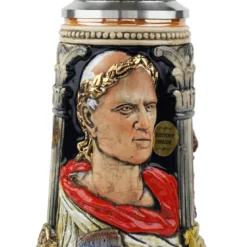 This German stein honors Caesar the emperor and commander of Rome depicted in relief with 24K gold painted laurel wreath and iconic red cape. The Colosseum is shown in miniature below. Three panels are bordered by Roman Corinthian style columns, the aquila-eagle roman legion symbol and griffin. The sides show Roman soldiers: riding a chariot and standing with shield and sword in front of the leaning tower of Pisa.Â