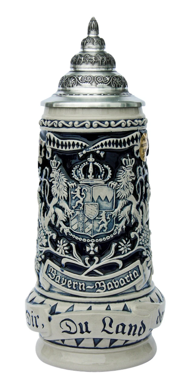 This beer stein honors the Land of Bavaria with a large relief Bavaria lion crest on the front. Alpine flowers, including blue gentian and edelweiss, and waiving Bavarian flags frame the crest. The sides depict two of Bavaria’s most notable landmarks: Neuschwanstein and Munich.