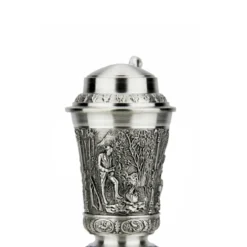 Beautifully detailed solid pewter mini stein krug with relief decoration of a Marksman (Freischütz) hunting in the Alps. The left panel shows the marksman with his kill and in the front panel he stops to enjoy his pipe after the kill is processed & ready to take home. The right side shows his skill with hunting calls, luring a mature elk out of the forest, while his horse and dog wait patiently. Fanciful pillars frame the scenes with oak leaf decoration on the lid. Medallions of wildlife & oak leaves wrap around this schnapps shot krug below the panels.
