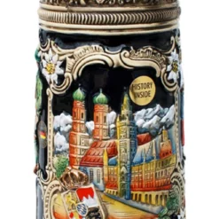 The Bavarian city of Munich (Munchen), well known for it’s world famous yearly Oktoberfest celebration, is the theme of this 2 liter stoneware beer stein. Richly hand-painted relief decoration is highlighted by the dark cobalt blue background. The front shows the Marienplatz (town square) framed by the Alps with Munich’s town hall (the Rathaus) and the most famous Glockenspiel (animated bell-tower) in the world. The banner reads “Munchen” with the city coat of arms. One side features the Frauenkirche (Our Lady’s Church) with it’s unmistakable onion domed towers or “Frauenturme”. The opposite side shows the Hofbrauhaus (HB), the most famous beer hall in the world, with a traditonally dressed couple dancing above. Edelweiss and decorative scrolling frame each scene.