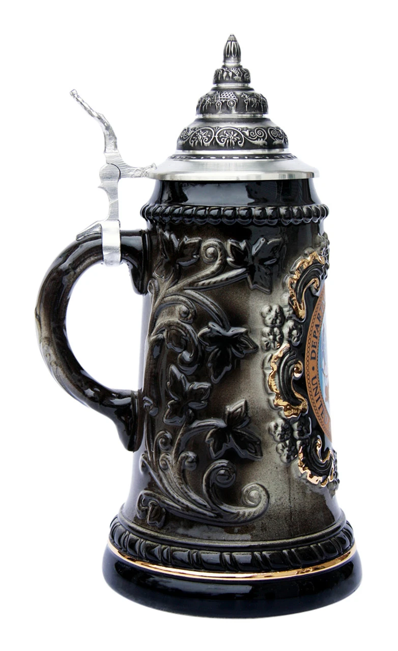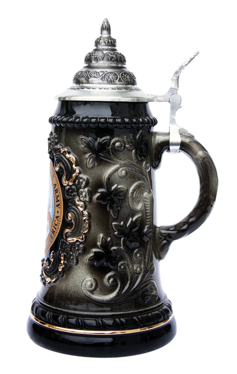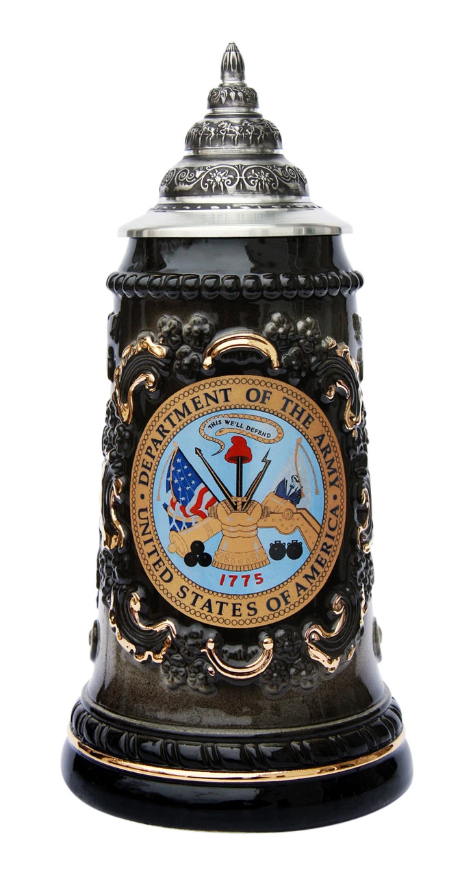 This elegant black & gray beer stein features the US Department of the Army emblem framed by a relief scroll design with 24K gold accents. The sides show a relief vine and leaf pattern. Pewter relief conical lid.