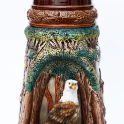 This impressive collectors piece features a unique grotto or cave that is molded into the body of this German stein. Inside the grotto a 4.75″ tall American bald eagle perches proudly on a rock. The eagle is made from compressed marble dust from the world famous Carrara mines and is hand painted in northern Italy. The body is filled with woodland creatures including a pheasant, red fox, elk, wild boar, deer and owl. The animals jump, perch and hide in their woodland habitat. The handle of this stein seems to grow from an oak tree and an acorn & oak leaf garland encircle the top. Hand painted relief decoration, dark brown glaze accents and pewter lid.