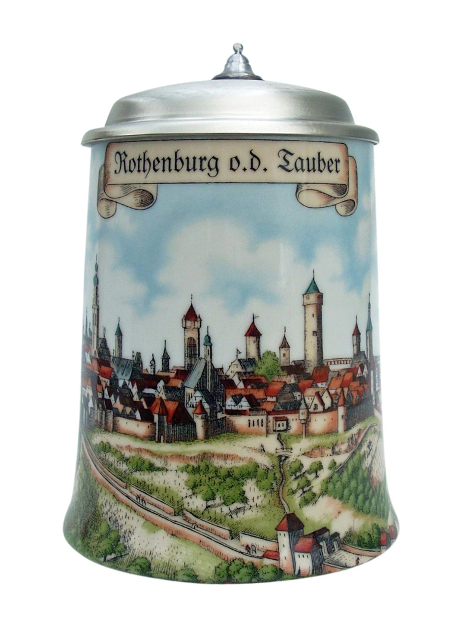 This porcelain stein features a colorful full wrap panorama of the city of Rothenburg, known for its well-preserved and romantic medieval buildings. The scene shows Rothenburg in olden times.